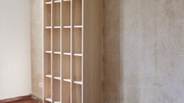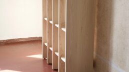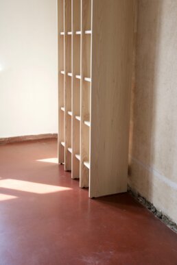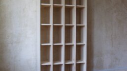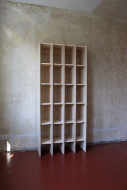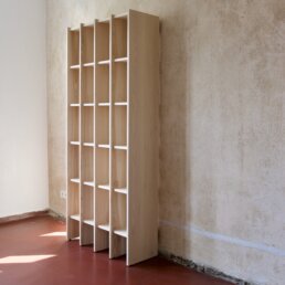 Dieses Bücherregal zeichnet sich durch gerade Linien und klare Formen aus. Charakteristisch sind die schmalen, gleichmäßig angeordneten Fächer, in denen sich Bücher platzsparend und übersichtlich unterbringen lassen. Die solide Bauweise ist präzise gearbeitet, hat einen puristischen Charakter und sorgt für Langlebigkeit und Stabilität.